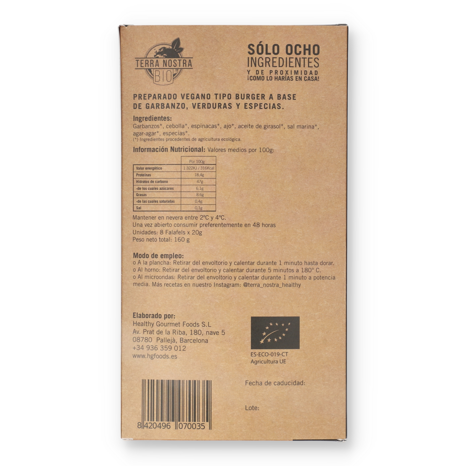Pack con 8 mini hamburguesas de falafel, de color cremoso con toques verdes y aroma y sabor propios del garbanzo que constituye la base de la composición del producto.