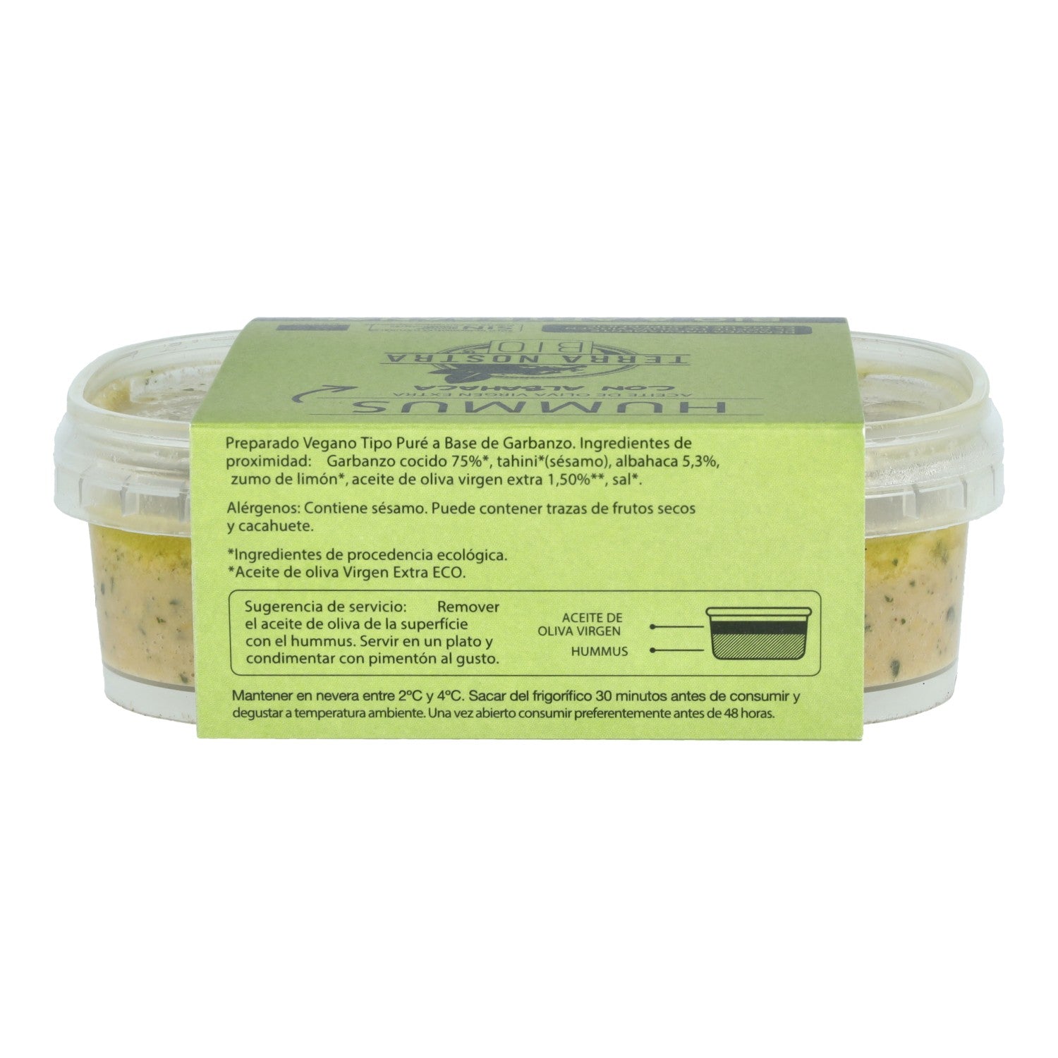 Garbanzos cocido 75%*, tahini*(sésamo), albahaca 5,3%, zumo de limón*, aceite de oliva virgen extra 1,50%**, sal*.